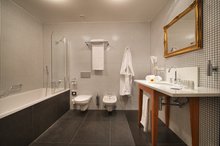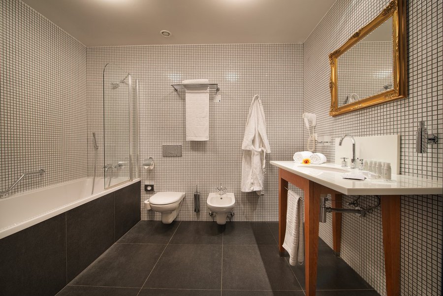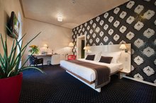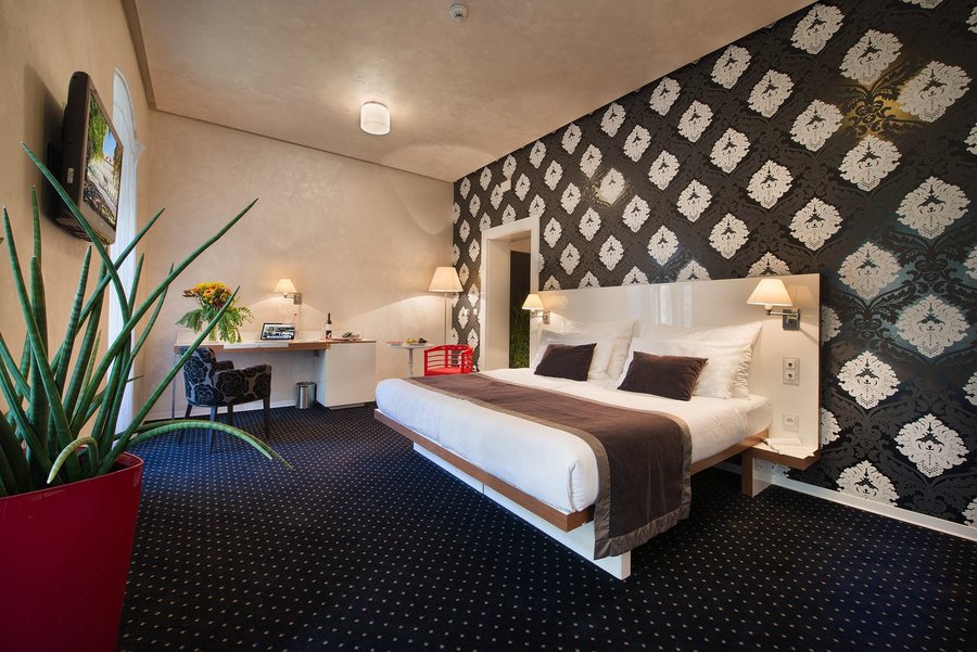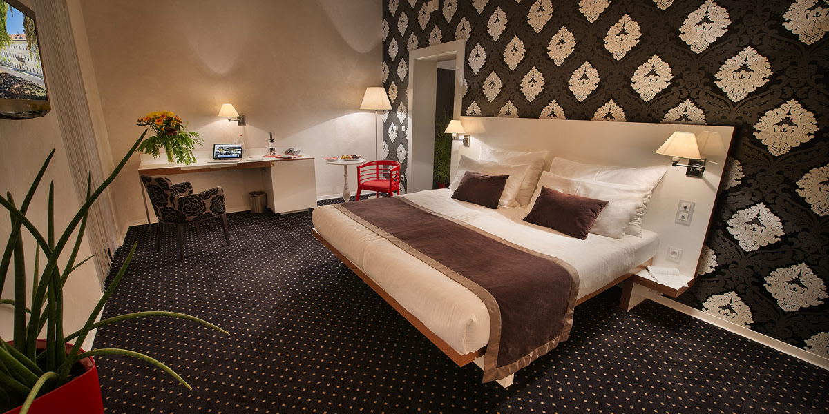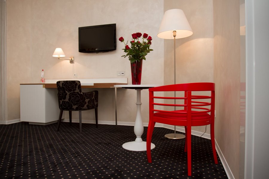 • Rooms are decorated in an elegant combination of red, black, gold, and white